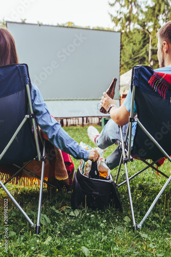 Couple Sitting In Camp Chairs In City Park Looking Movie Outdoors At Open Air Cinema Stock Photo Adobe Stock